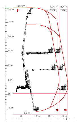 A bundle of power and technology capable of performing in any application. It has four stabilisation areas, two working areas and climbing outriggers for working on all types of terrain and reaching even the most difficult spots with its maximum working height of 30.3m, lateral outreach of 15.4m and the abillity to work in negative down to -6.7m.