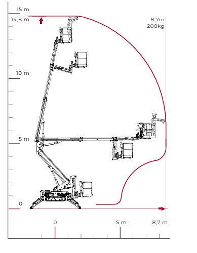 Geometric platform without outreach limiting device, with pantograph and single telescopic boom plus jib. It offers excellent performance in all types of work, thanks to a compact stabilisation area that provides maximum stability even on the most difficult terrains.