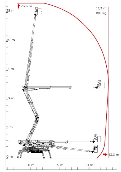 Electrically isolated up to 46 kV, The CMC i27 is a double pantograph geometric platform with the largest unrestricted outreach in its class. With its 27-metre working height, three stabilisation areas and automatic stabiliser levelling, it can perform at its best in any conditions.