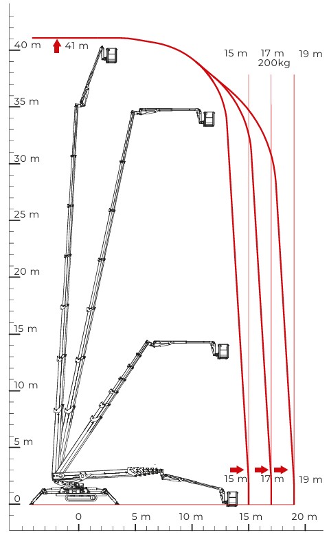 CMC S41 is capable of reaching the extraordinary working height of 41m above the ground and the lateral outreach up to 19m with a unique payload of 200kg.
